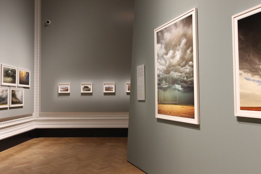 This exhibition is organised across two galleries within the Photography centre at the V&A. The two angled walls in the first gallery create a striking dialogue with the classical architecture and add a sense of disruption in line with 'Storm'. In the second gallery, space is organised around a 30 metre long photograph. The chromatic palette is neutral with strikes of yellow on the wall ends, and a lighter colour on part of the walls to give rythm to the space.